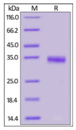 Molecular Mass : | The protein has a calculated MW of 27.0 kDa. The protein migrates as 33-35 kDa under reducing (R) condition (SDS-PAGE) due to glycosylation. |