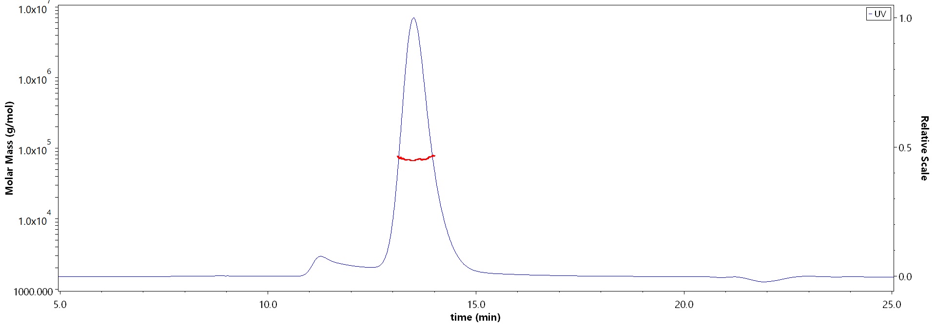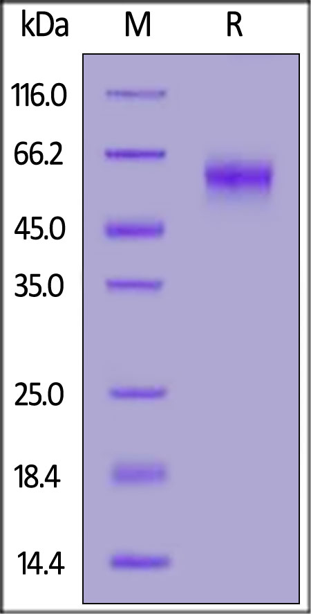 | Molecular Mass : | The protein has a calculated MW of 34.9 kDa. The protein migrates as 55-66 kDa under reducing (R) condition (SDS-PAGE) due to glycosylation. |