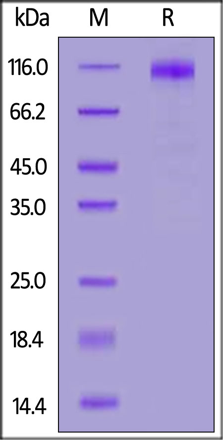 | Molecular Mass : | The protein has a calculated MW of 76.7 kDa. The protein migrates as 100-120 kDa under reducing (R) condition (SDS-PAGE) due to glycosylation. |