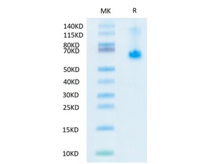 | Molecular Mass : | The protein has a predicted MW of 49.7kDa.Due to glycosylation, the protein migrates to 60-70 KDa based on Bis-Tris PAGE result. |
