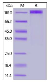 Molecular Mass : | The protein has a calculated MW of 101.9 kDa. The protein migrates as 115-130 kDa under reducing (R) condition (SDS-PAGE) due to glycosylation. |