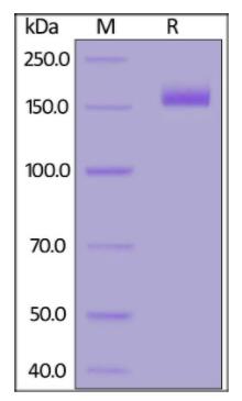 | Molecular Mass : | The protein has a calculated MW of 139.7 kDa. The protein migrates as 150-200 kDa under reducing (R) condition (SDS-PAGE) due to glycosylation. |