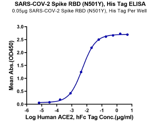 | Bio-activity : | Immobilized SARS-COV-2 Spike RBD (N501Y) , His Tag at 0.5μg/ml (100μl/Well) on the plate. Dose response curve for Human ACE2, hFc Tag with the EC50 of 5.1ng/ml determined by ELISA. |