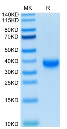 The protein has a predicted MW of 27 kDa. Due to glycosylation, the protein migrates to 36-40 kDa based on Tris-Bis PAGE result. |