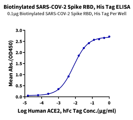 Immobilized Biotinylated SARS-COV-2 Spike RBD, His Tag at 1μg/ml (100μl/well) on the streptavidin precoated plate (5μg/ml). Dose response curve for Human ACE2, hFc Tag with the EC50 of 7.7ng/ml determined by ELISA. |