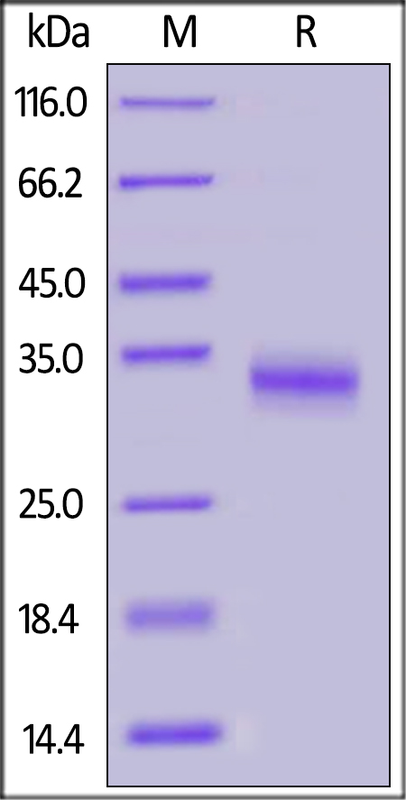| Molecular Mass : | The protein has a calculated MW of 27.0 kDa. The protein migrates as 33-35 kDa under reducing (R) condition (SDS-PAGE) due to glycosylation. |