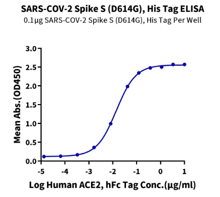 | Bio-activity : | Immobilized SARS-COV-2 Spike S Trimer (D614G), His Tag at 1μg/ml (100μl/well) on the plate. Dose response curve for Human ACE2, hFc Tag with the EC50 of 14.0ng/ml determined by ELISA. |