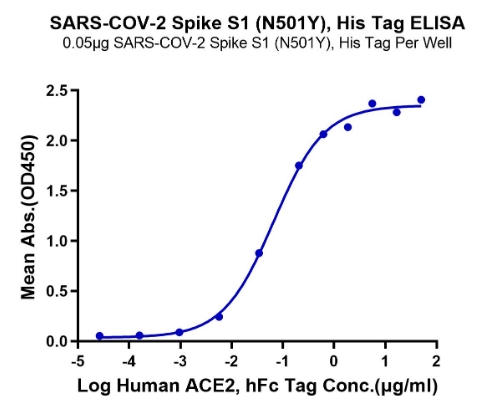 | Bio-activity : | Immobilized SARS-COV-2 Spike S1 (N501Y) , His Tag at 0.5μg/ml (100μl/Well) on the plate. Dose response curve for Human ACE2, hFc Tag with the EC50 of 66.2ng/ml determined by ELISA. |