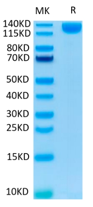 | Molecular Mass : | The protein has a predicted MW of 102.6 kDa. Due to glycosylation, the protein migrates to 130-140 kDa based on Tris-Bis PAGE result. |