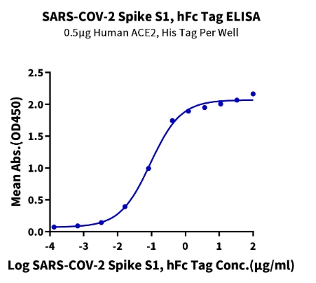| Bio-activity : | Immobilized Human ACE2, His Tag at 5μg/ml (100μl/well) on the plate. Dose response curve for SARS-COV-2 Spike S1, hFc Tag with the EC50 of 92.3ng/ml determined by ELISA. |