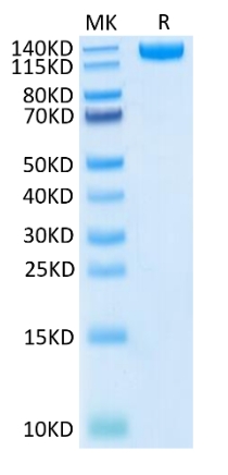 The protein has a predicted MW of 102.6 kDa. Due to glycosylation, the protein migrates to 130-140 kDa based on Tris-Bis PAGE result. |