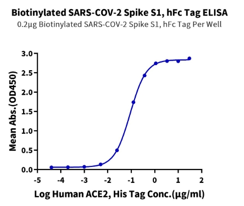 Immobilized Biotinylated SARS-COV-2 Spike S1, hFc Tag at 2μg/ml (100μl/well) on the streptavidin precoated plate (5μg/ml). Dose response curve for Human ACE2, His Tag with the EC50 of 0.09μg/ml determined by ELISA. |