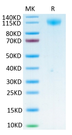 | Molecular Mass : | The protein has a predicted MW of 77.9 kDa. Due to glycosylation, the protein migrates to 110-120 kDa based on Tris-Bis PAGE result. |