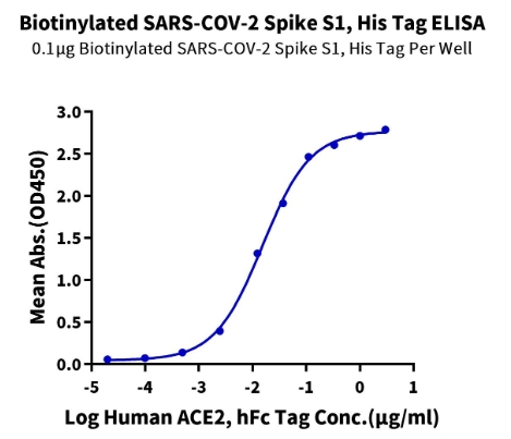 Immobilized Biotinylated SARS-COV-2 Spike S1, His Tag at 1μg/ml (100μl/well) on the streptavidin precoated plate (5μg/ml). Dose response curve for Human ACE2, hFc Tag with the EC50 of 15.3ng/ml determined by ELISA. |