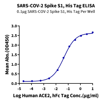 | Bio-activity : | Immobilized SARS-COV-2 Spike S1, His Tag at 1μg/ml (100μl/well) on the plate. Dose response curve for Human ACE2, hFc Tag with the EC50 of 45.7ng/ml determined by ELISA. |