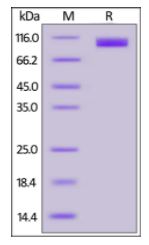 Molecular Mass : | The protein has a calculated MW of 85.7 kDa. The protein migrates as 90-115 kDa under reducing (R) condition (SDS-PAGE) due to glycosylation. |