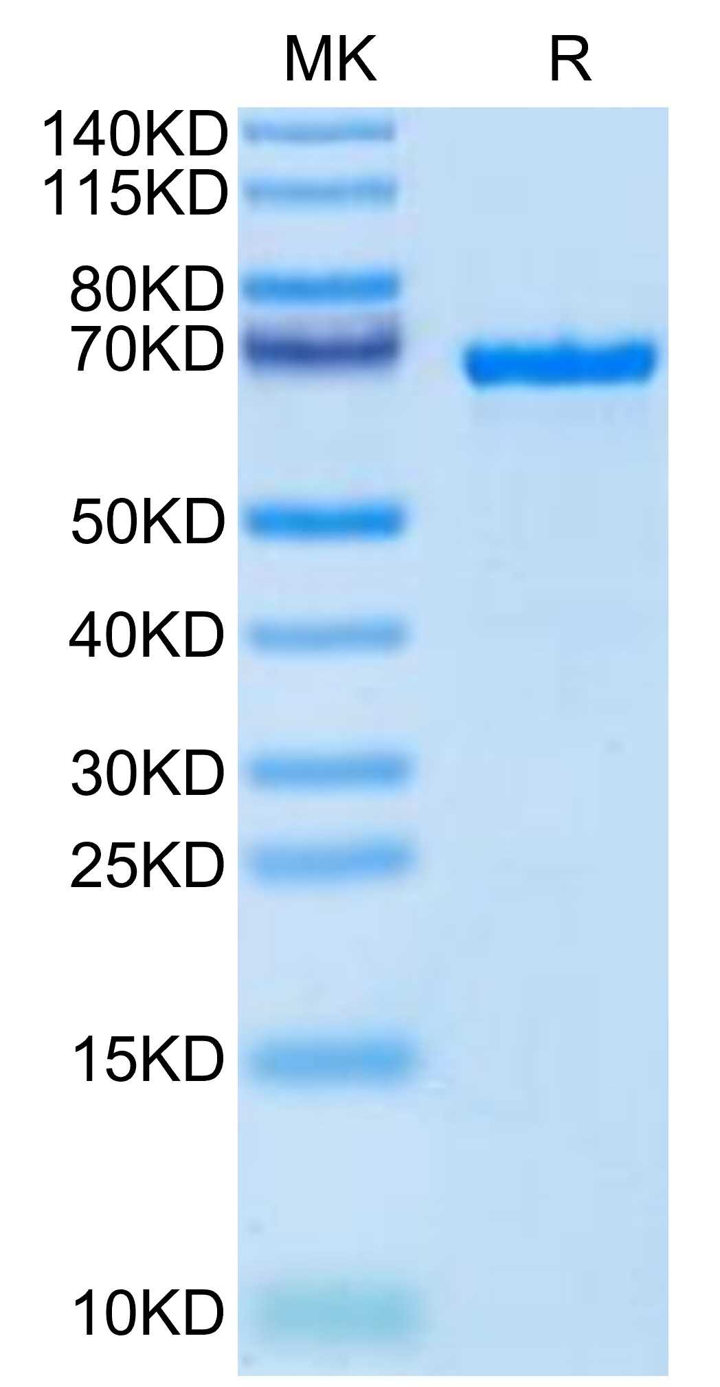 Molecular Mass : | The protein has a predicted MW of 67.53 kDa. Due to glycosylation, the protein migrates to 68-75 kDa based on Tris-Bis PAGE result. |