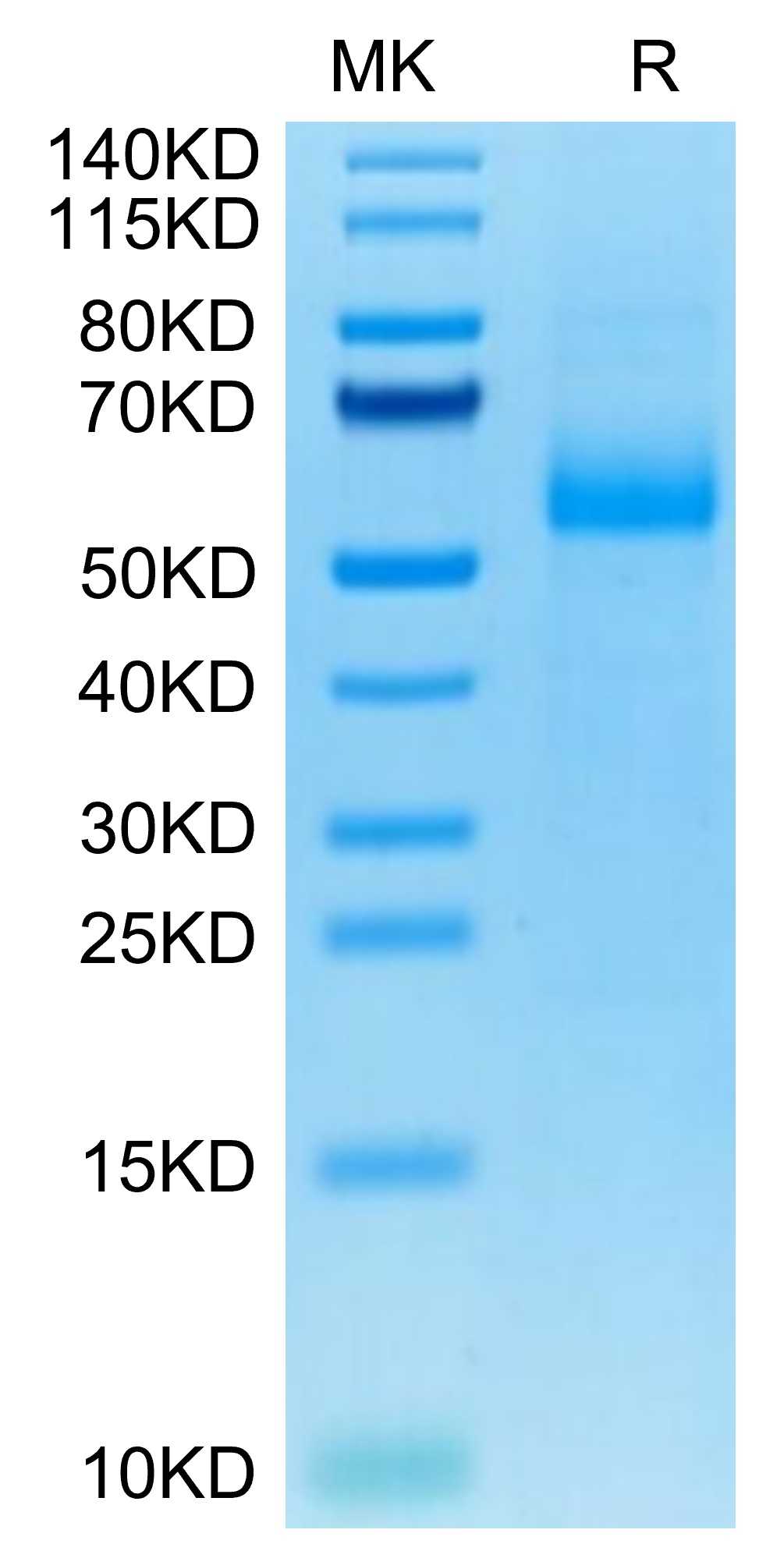 | Molecular Mass : | The protein has a predicted MW of 36.78 kDa. Due to glycosylation, the protein migrates to 50-65 kDa based on Tris-Bis PAGE result. |