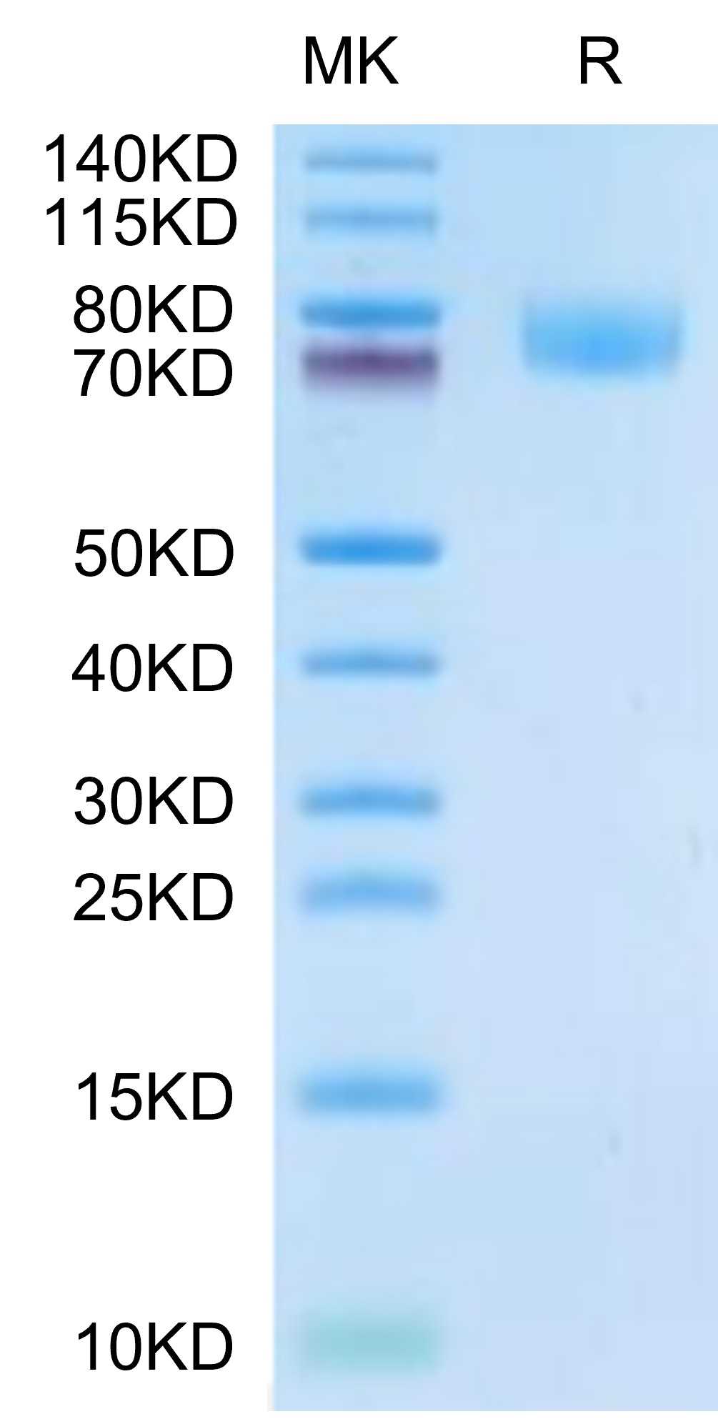 Molecular Mass : | The protein has a predicted MW of 57.10 kDa. Due to glycosylation, the protein migrates to 70-85 kDa based on Tris-Bis PAGE result. |