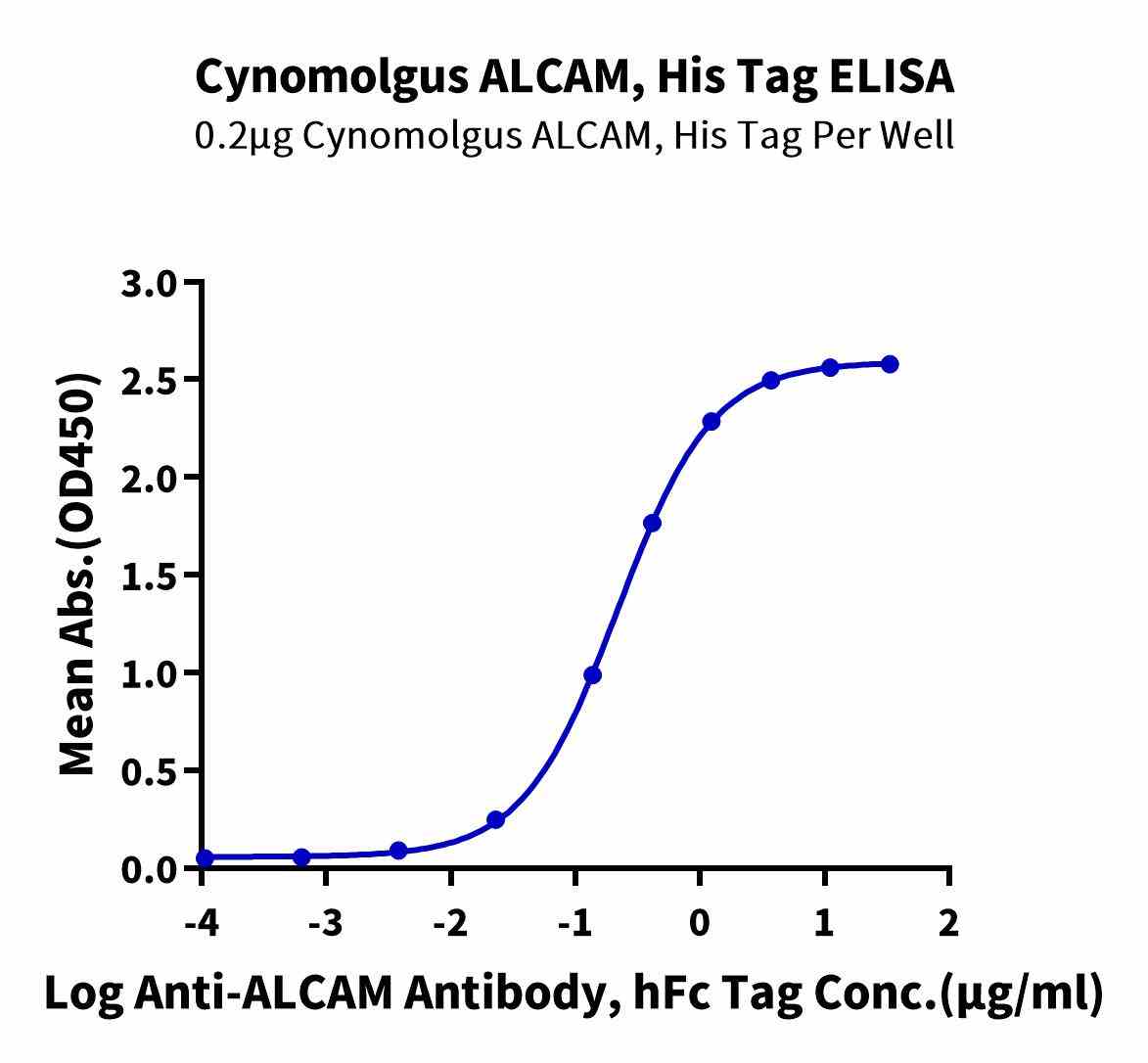 | Bio-activity : | Immobilized Cynomolgus ALCAM, His Tag at 2μg/ml (100μl/Well) on the plate. Dose response curve for Anti-ALCAM Antibody, hFc Tag with the EC50 of 0.22μg/ml determined by ELISA. |