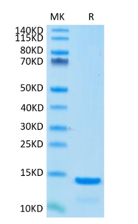 Molecular Mass : | The protein has a predicted MW of 12.7 kDa. Due to glycosylation, the protein migrates to 13-15 kDa based on Tris-Bis PAGE result. |