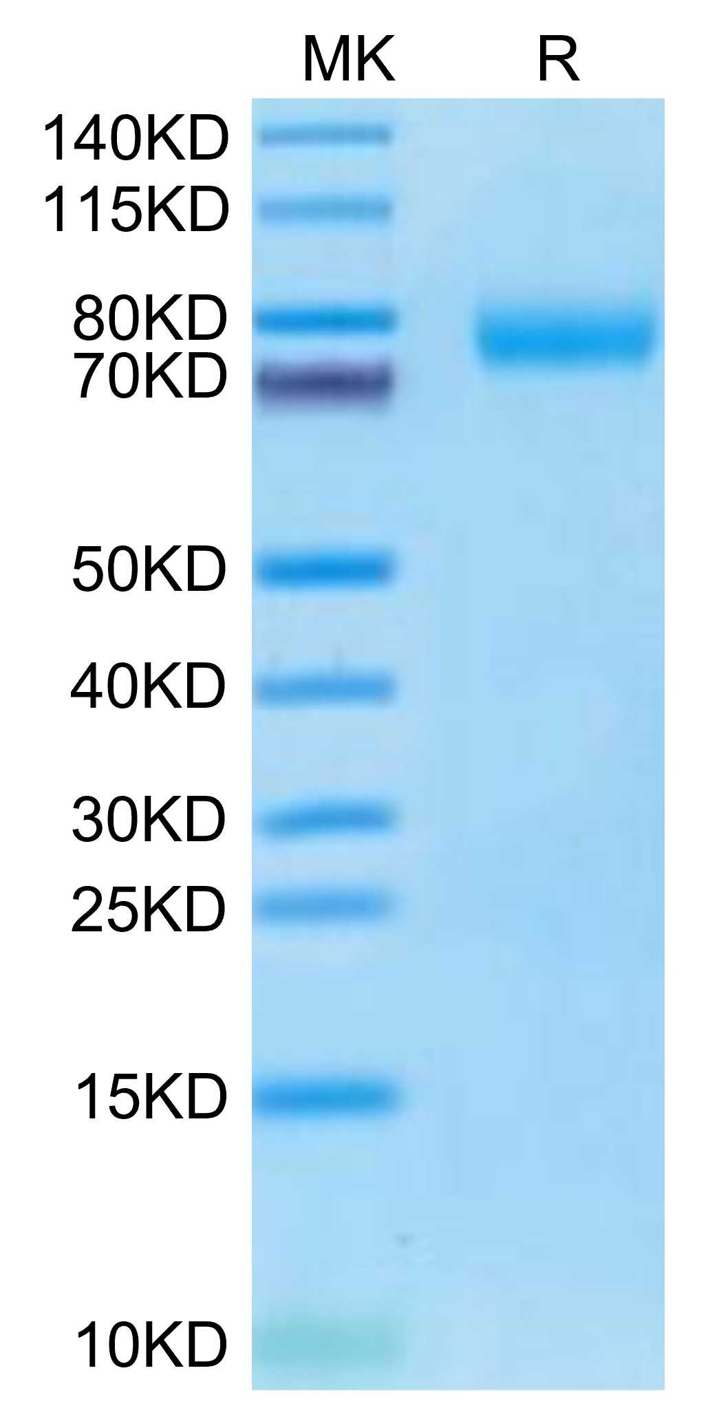 | Molecular Mass : | The protein has a predicted MW of 57.42 kDa. Due to glycosylation, the protein migrates to 70-80 kDa based on Tris-Bis PAGE result. |