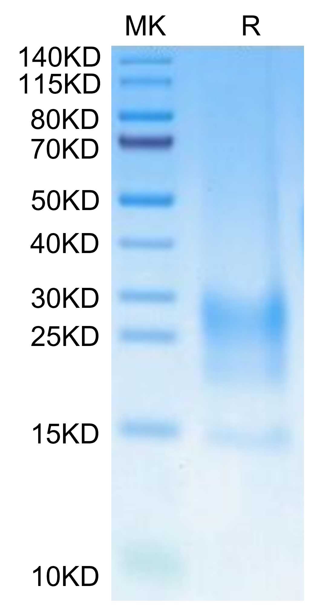| Molecular Mass : | The protein has a predicted MW of 13.78 kDa. Due to glycosylation, the protein migrates to 15-30 kDa based on Tris-Bis PAGE result. |