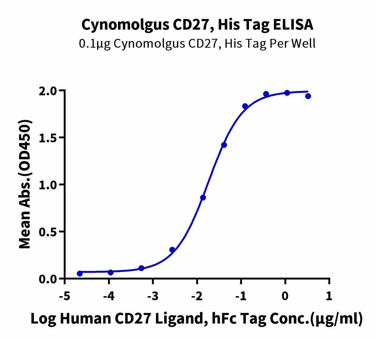 | Bio-activity : | Immobilized Cynomolgus CD27, His Tag at 1μg/ml (100μl/well) on the plate. Dose response curve for Human CD27 Ligand, hFc Tag with the EC50 of 17.6ng/ml determined by ELISA. |