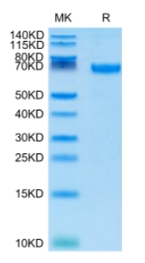 Molecular Mass : | The protein has a predicted MW of 52 kDa. Due to glycosylation, the protein migrates to 60-70 kDa based on Tris-Bis PAGE result. |