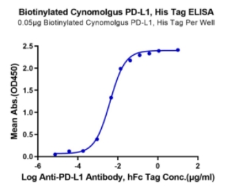 Immobilized Biotinylated Cynomolgus/Rhesus macaque PD-L1, His Tag at 0.5μg/ml (100μl/Well) on the plate. Dose response curve for Anti-PD-L1 Antibody, hFc Tag with the EC50 of 4.0ng/ml determined by ELISA. |