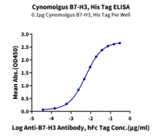 | Bio-activity : | Immobilized Cynomolgus B7-H3, His Tag at 1μg/ml (100μl/Well) on the plate. Dose response curve for Anti-B7-H3 Antibody, hFc Tag with the EC50 of 5.5ng/ml determined by ELISA. |