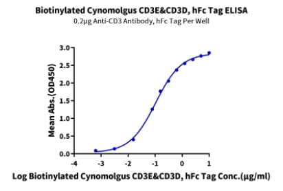 Immobilized Anti-CD3 Antibody, hFc Tag at 2μg/ml (100 μl/well) on the plate. Dose response curve for Biotinylated Cynomolgus CD3E&CD3D, hFc Tag with the EC50 of 0.10μg/ml determined by ELISA. |