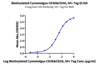 Immobilized Anti-CD3 Antibody, hFc Tag at 2μg/ml (100μl/well) on the plate. Dose response curve for Biotinylated Cynomolgus CD3E&CD3G, hFc Tag with the EC50 of 50.5ng/ml determined by ELISA. |