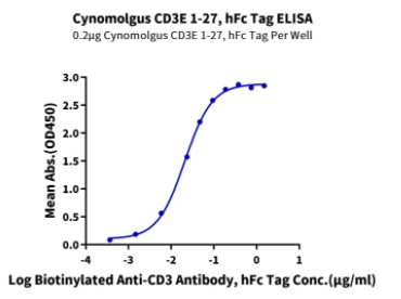 Immobilized Cynomolgus CD3E 1-27, hFc Tag at 2μg/ml (100μl/Well) on the plate. Dose response curve for Biotinylated Anti-CD3 Antibody, hFc Tag with the EC50 of 52.3ng/ml determined by ELISA. |