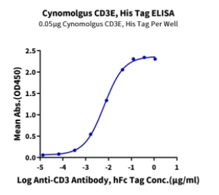 | Bio-activity : | Immobilized Cynomolgus CD3E, His Tag at 0.5μg/ml (100μl/well) on the plate. Dose response curve for Anti-CD3 Antibody, hFc Tag with the EC50 of 6.4ng/ml determined by ELISA. |