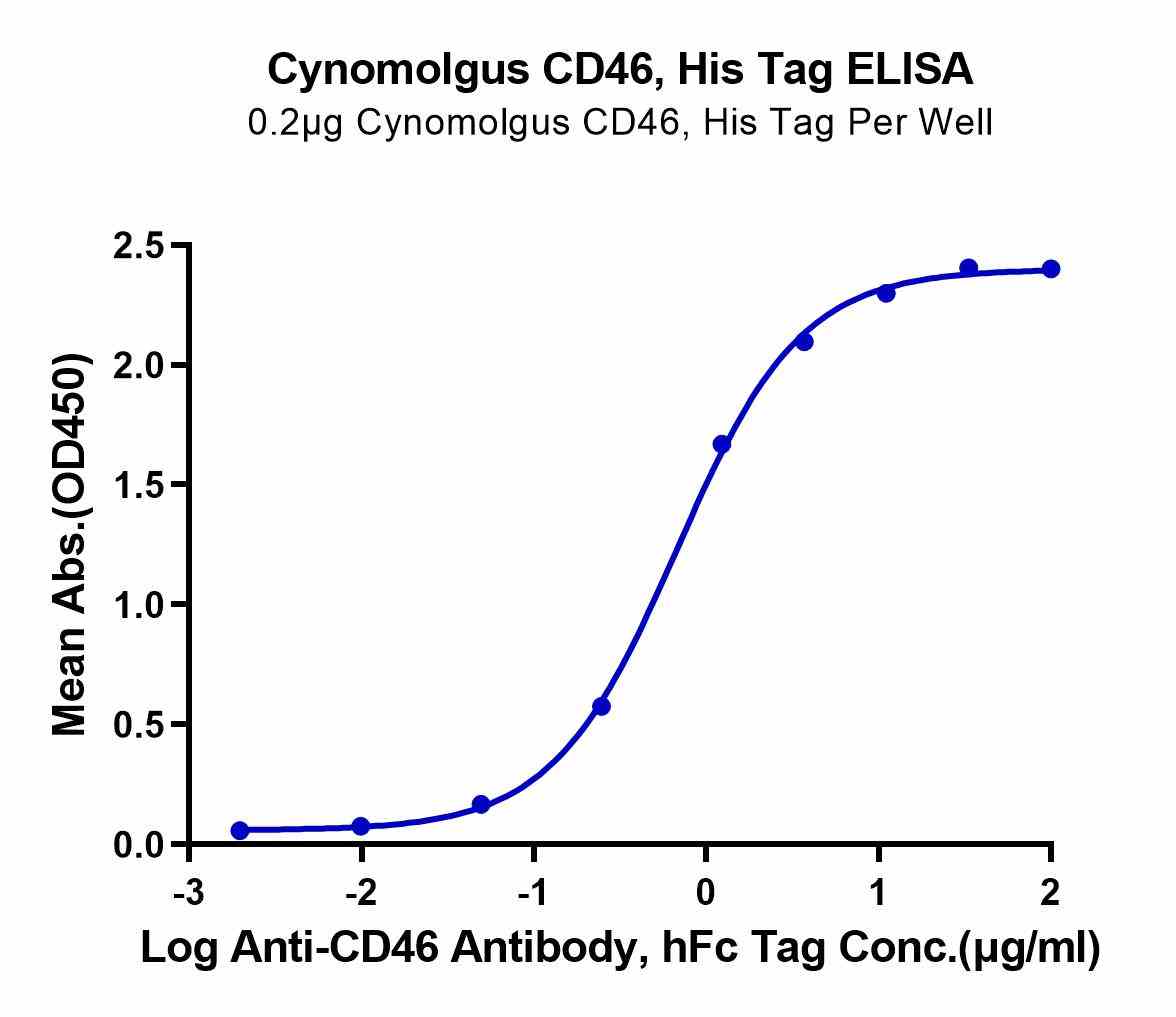 Immobilized Cynomolgus CD46, His Tag at 2μg/ml (100μl/well) on the plate. Dose response curve for Anti-CD46 Antibody, hFc Tag with the EC50 of 0.67μg/ml determined by ELISA. |