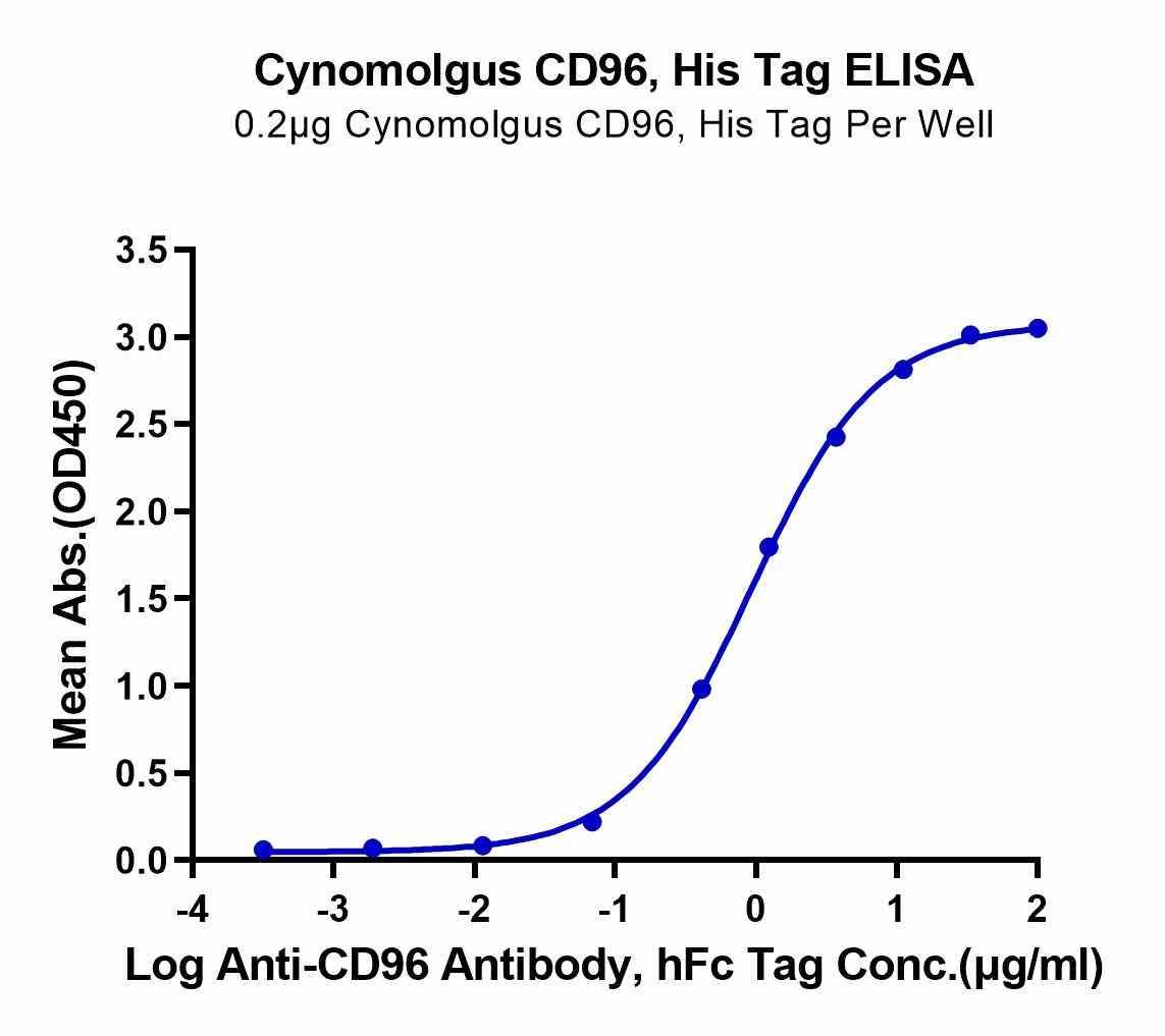Immobilized Cynomolgus CD96, His Tag at 2μg/ml (100μl/well) on the plate. Dose response curve for Anti-CD96 Antibody, hFc Tag with the EC50 of 0.93μg/ml determined by ELISA. |