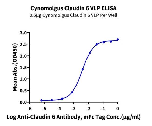 | Bio-activity : | Immobilized Cynomolgus Claudin 6 VLP at 5 ug/ml (100 ul/Well) on the plate. Dose response curve for Anti-Claudin 6 Antibody, mFc Tag with the EC50 of 4 ng/ml determined by ELISA. |