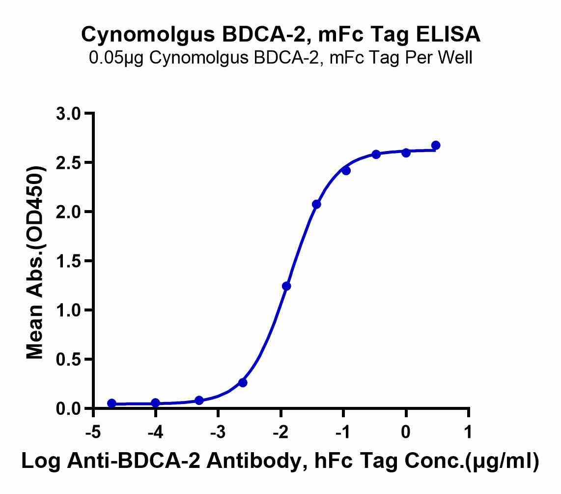 | Bio-activity : | Immobilized Cynomolgus BDCA-2, mFc Tag at 0.5μg/ml (100μl/well) on the plate. Dose response curve for Anti-BDCA-2 Antibody, hFc Tag with the EC50 of 10.9ng/ml determined by ELISA. |