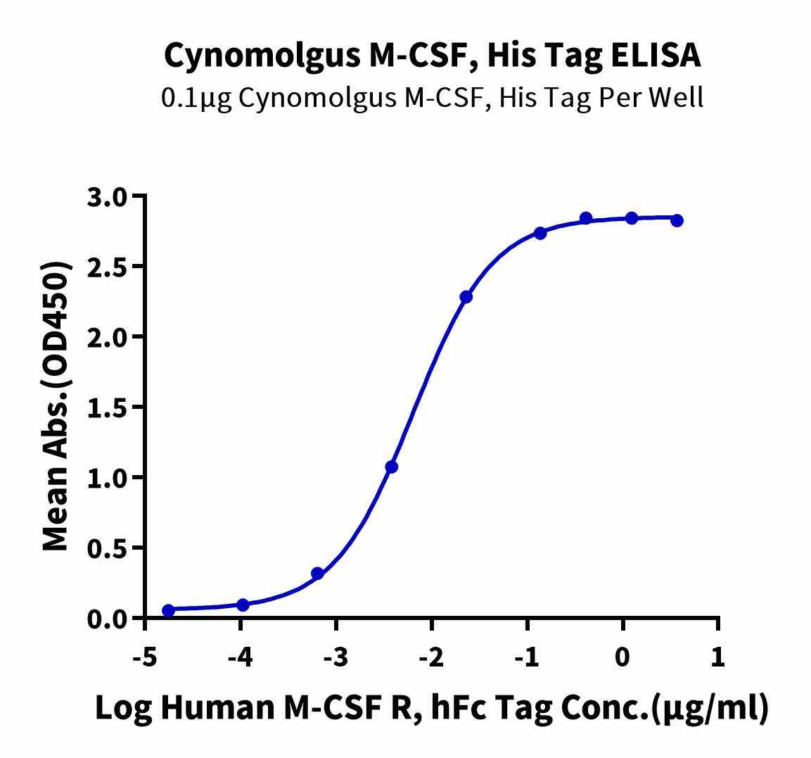 Immobilized Cynomolgus M-CSF, His Tag at 1μg/ml (100μl/well) on the plate. Dose response curve for Human M-CSF R, hFc Tag with the EC50 of 6.5ng/ml determined by ELISA. |