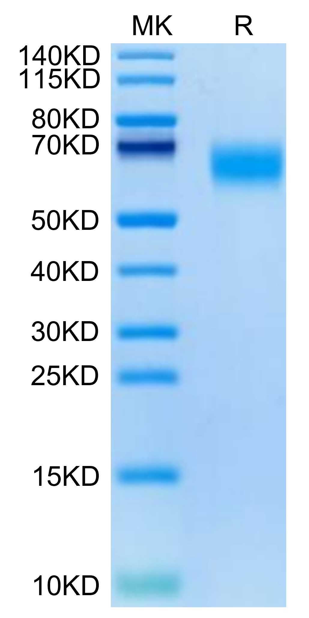 Molecular Mass : | The protein has a predicted MW of 35.47 kDa. Due to glycosylation, the protein migrates to 60-70 kDa based on Tris-Bis PAGE result. |