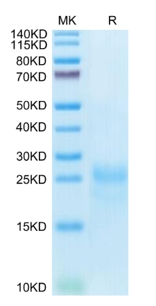 Molecular Mass : | The protein has a predicted MW of 14.4 kDa. Due to glycosylation, the protein migrates to 25-30 kDa based on Tris-Bis PAGE result. |