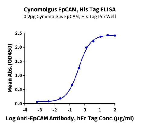 | Bio-activity : | Immobilized Cynomolgus/Rhesus macaque EpCAM, His Tag at 2μg/ml (100μl/well) on the plate. Dose response curve for Anti-EpCAM Antibody, hFc Tag with the EC50 of 0.38μg/ml determined by ELISA. |