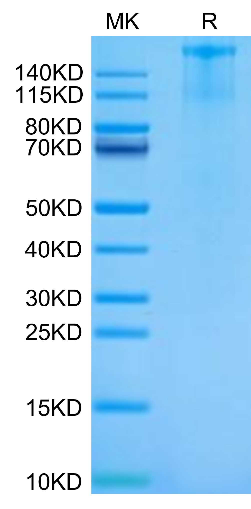 | Molecular Mass : | The protein has a predicted MW of 84.58 kDa. Due to glycosylation, the protein migrates to 160-180 kDa based on Tris-Bis PAGE result. |