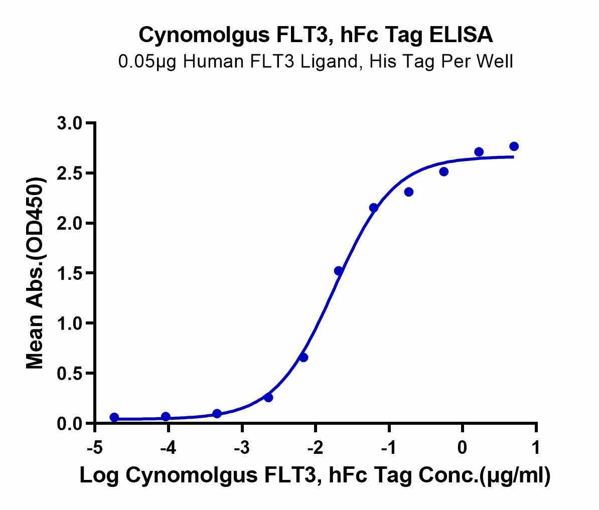 Immobilized Human FLT3 Ligand, His Tag at 0.5μg/ml (100μl/well) on the plate. Dose response curve for Cynomolgus FLT3, hFc Tag with the EC50 of 18.2ng/ml determined by ELISA. |