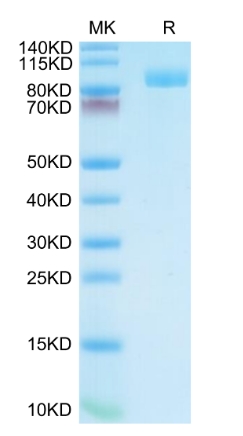 The protein has a predicted MW of 80.6 kDa. Due to glycosylation, the protein migrates to 90-110 kDa based on Tris-Bis PAGE result. |