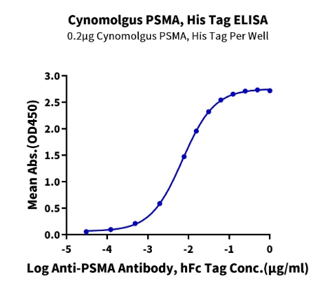 Immobilized Cynomolgus PSMA, His Tag at 2μg/ml (100μl/Well) on the plate. Dose response curve for Anti-PSMA Antibody, hFc Tag with the EC50 of 7.1ng/ml determined by ELISA. |
