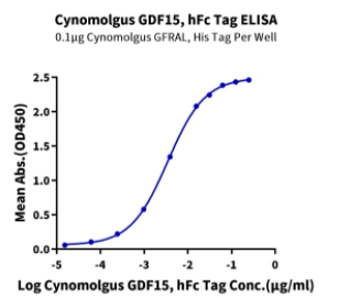 Immobilized Cynomolgus GFRAL, His Tag at 1ug/ml (100ul/well) on the plate. Dose response curve for Cynomolgus GDF15, hFc Tag with the EC50 of 3.5ng/ml determined by ELISA. |