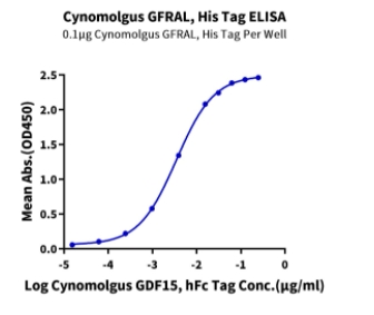 | Bio-activity : | Immobilized Cynomolgus GFRAL, His Tag at 1μg/ml (100μl/well) on the plate. Dose response curve for Cynomolgus GDF15, hFc Tag with the EC50 of 3.5ng/ml determined by ELISA. |