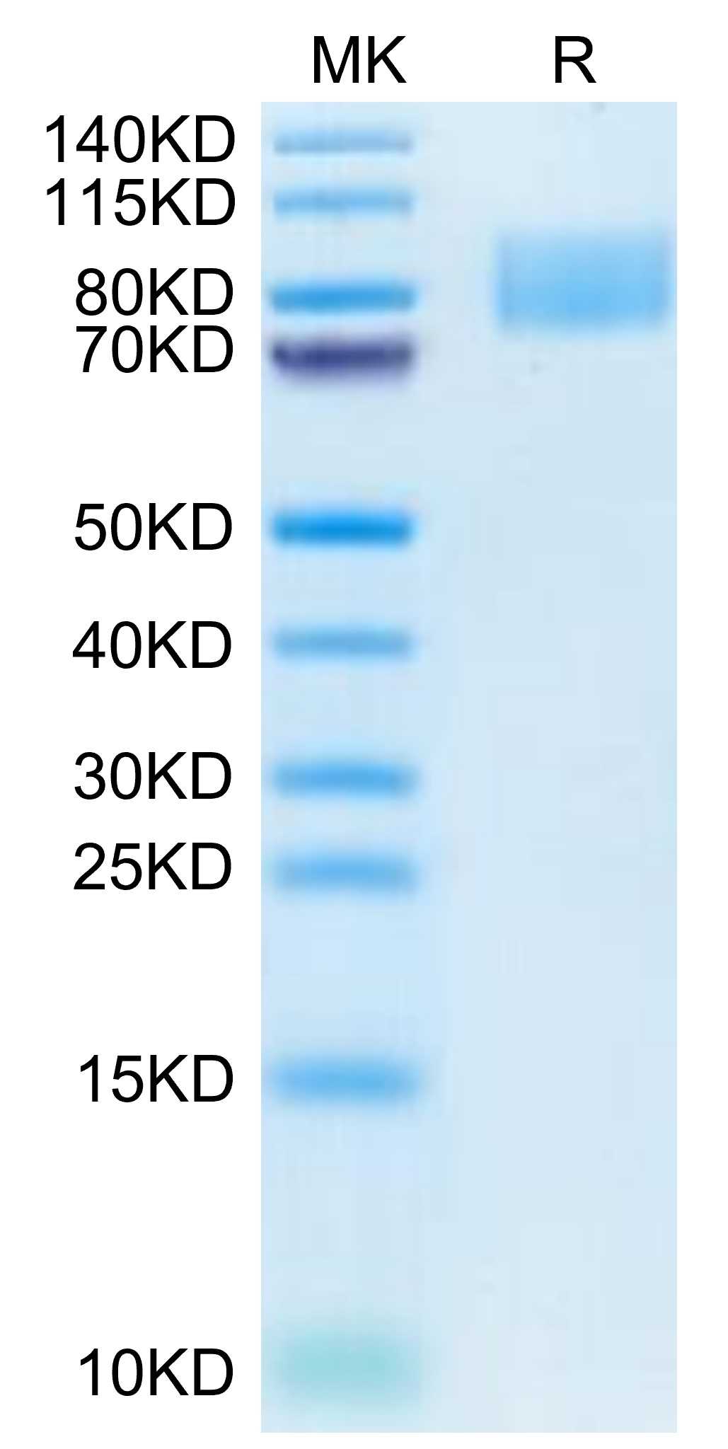 Molecular Mass : | The protein has a predicted MW of 50.55 kDa. Due to glycosylation, the protein migrates to 75-100 kDa based on Tris-Bis PAGE result. |
